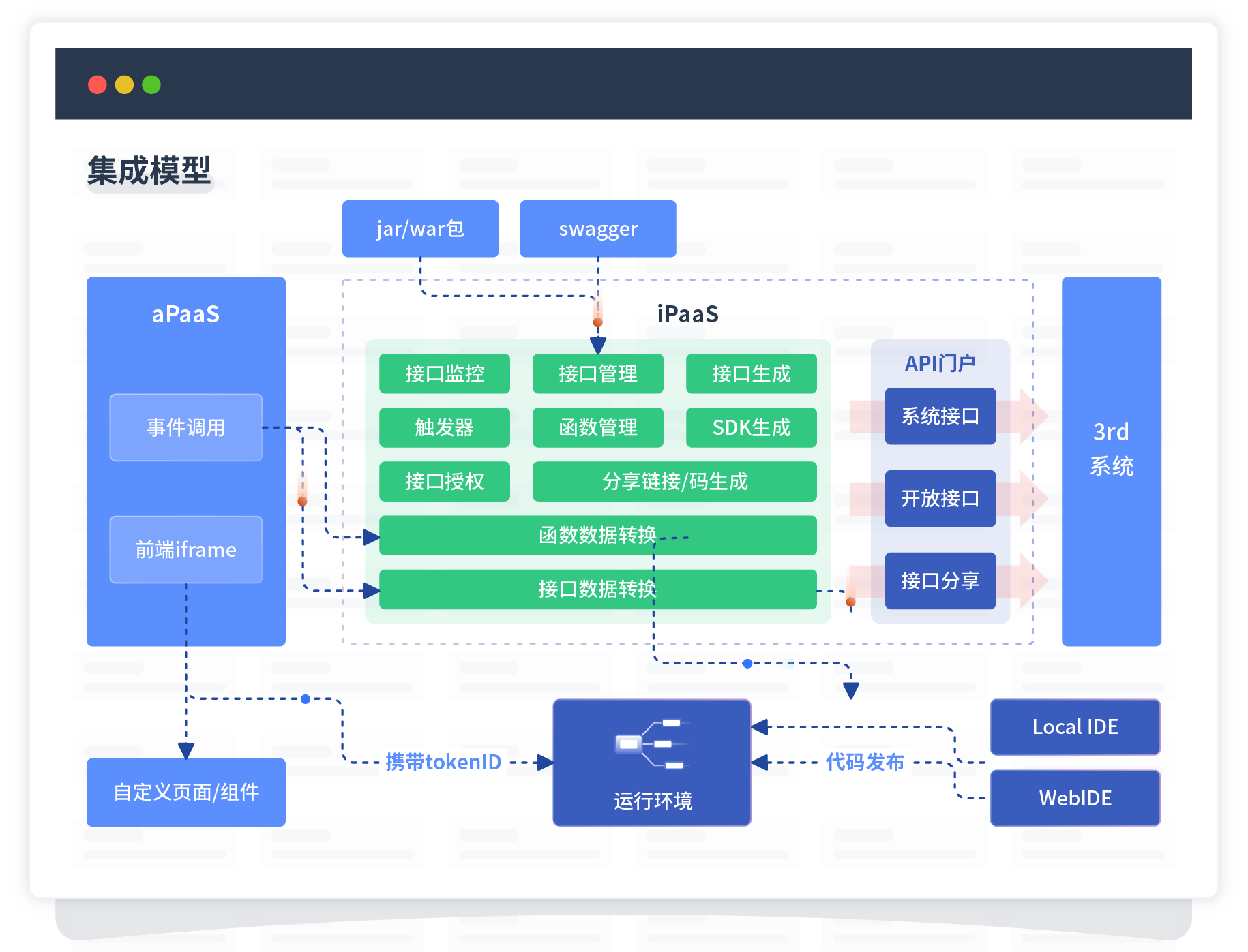 集成模型包括平台本身前、、、、、、、、、、、、、、、后端能力的扩展,,,,,,,,,,也支持通过API门户和第三方系统进行交互。。。。。。。。。。。