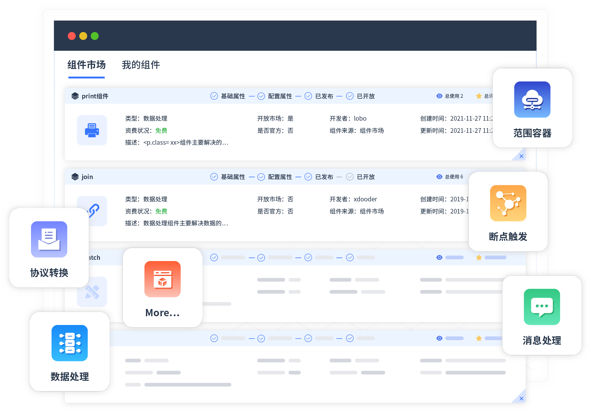 针对集成场景,,,,,,,,,小微钱包提供组件市场,,,,,,例如协议转换、、、、、、、、、、、消息处理、、、、、文件操作等。。。。。。。。。。。。。除平台提供的组件外,,,,,,,客户可以自定义所需组件。。。。。。。。。。。。