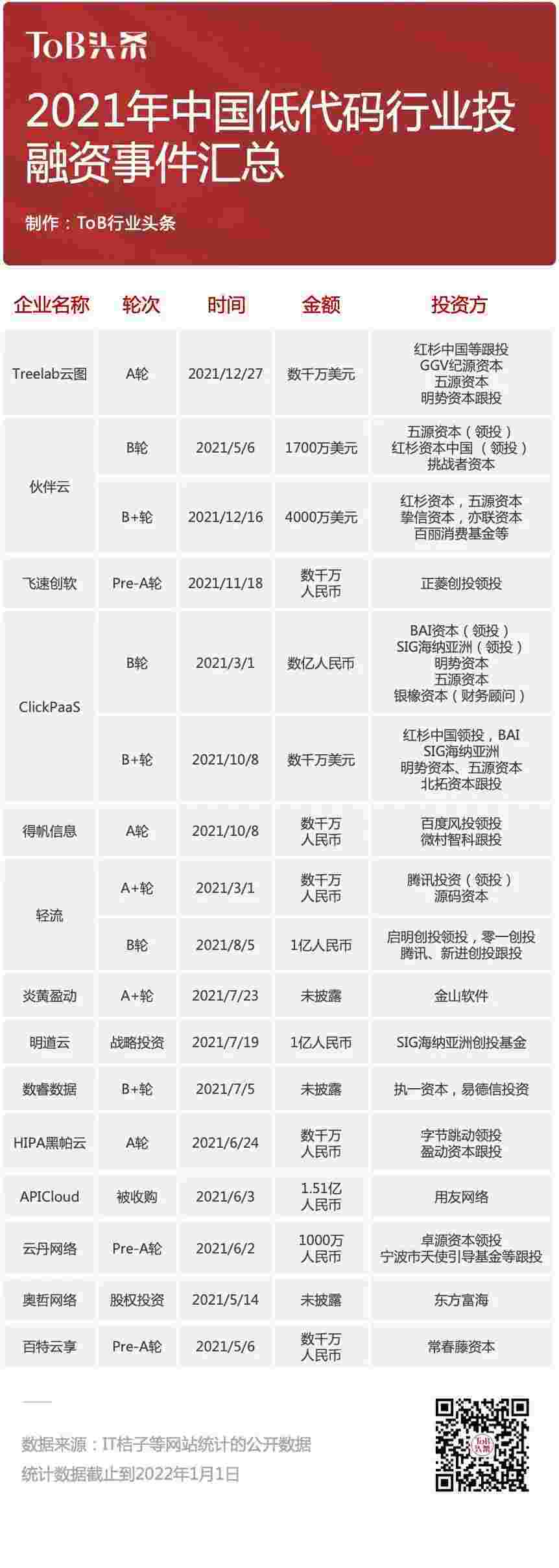 到2021年,,,,,,,,,,,无/低代码投融资规模势头更甚,,,,,,,其中包括轻流两轮融资(A+轮数千万人民币,,,,,,,,,,B轮近亿人民币)、、、、、、、、、、、、、小微钱包 两轮融资(B轮数亿人民币,,,,,,,,,,,,B+轮数千万美元)、、、、、、、、、、百特云享数千万元Pre-A轮融资......